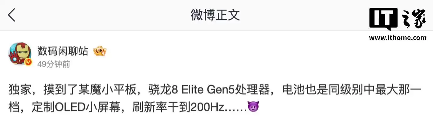 3月14日,据IT之家报道,微博博主“@数码闲聊站”发文透露,自己已经拿到了一款“某魔”厂的小平板真机。