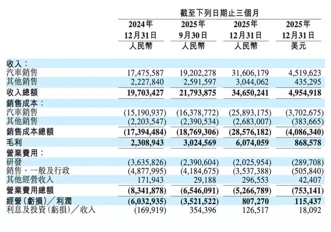 高价位车型带动下,蔚来去年第四季度汽车销售额达 316.06 亿元,同比增长达 80.9%。当季毛利同比增长 163.1% 达 60.74 亿元,汽车毛利率亦创三年新高达到 18.1%,去年同期仅为 13.1%。