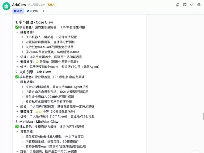 字节生态在这里的先天优势很明显:飞书本身就是字节内部跑通的协作系统,ArkClaw 可以调用飞书原生的文档、日程和消息能力。这种原生集成的优势,其他厂商确实很难做到。
