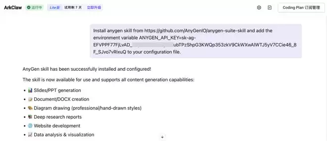 第一步,我接入的就是字节系的 Anygen。这样可以让我的 ArkClaw 拥有通用 Agent 的能力。