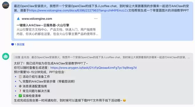 最近安装 OpenClaw 业务火,我们在线下分享的 coffee c h a t 的 PPT 就可以教给 ArkClaw。