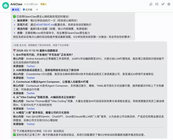 然后用 ArkClaw 实现对生成内容的定时读取:ArkClaw >> 定时读取 >> 飞书文档 >> 给到我