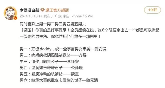 3月14日,一部名为《逐玉》的古装剧,以一种意想不到的方式杀出重围——不是因为权谋戏有多烧脑,而是因为“男一男二男三男四男五”全员高颜值的男性角色阵容,被观众集体送上热搜,并戏称为“逐玉完颜男团”。一场“同时爱上多个角色”的追剧热潮,正席卷而来。