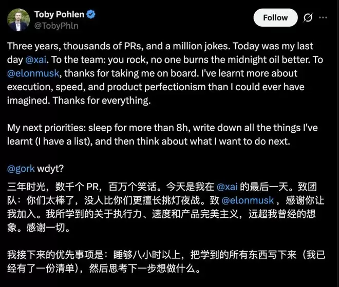 他在X上的离职感言中,隐约也谈到了马斯克硬核管理风格下的公司文化:
