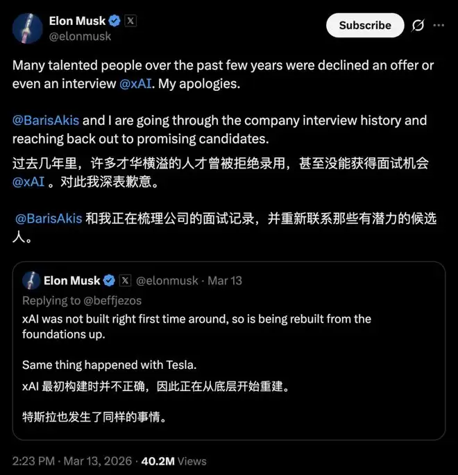 马斯克承认xAI「一开始就搭错了」,这个「认错」的时点有些微妙。