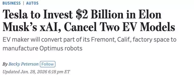 2026年1月28日,特斯拉发布四季度财报,披露已向xAI的E轮融资投入20亿美元,以外部报道的约2300亿美元的估值购得优先股。