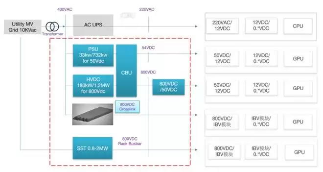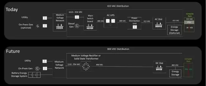 英伟达从415伏交流(上)到800伏直流(下)的配电架构演进(图源/企业)