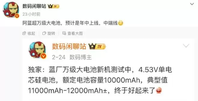 在此之前,同一位博主的爆料也提到过,蓝厂(vivo)万级大电池新机测试中,采用 4.53V 单电芯硅电池,额定电池容量 10000mAh,典型值为 11000mAh-12000mAh±。