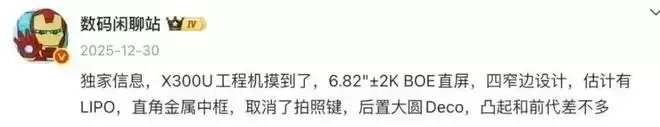 此前,博主@数码闲聊站 的一份爆料中提到过,“独家信息,X300U工程机摸到了,6.82"±2K BOE直屏,四窄边设计,估计有LIPO,直角金属中框,取消了拍照键,后置大圆Deco,凸起和前代差不多”。