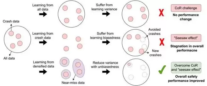 为此,研究人员设计了包括三个层级的数据密化机制,不仅大幅提升了训练数据的信息密度,在保证策略梯度估计无偏性的前提下,密集学习方法还显著降低了训练的方差,成功突破了自动驾驶安全性能的停滞瓶颈。