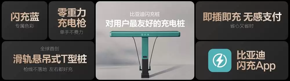 产品设计与体验方面,比亚迪全球首创滑轨悬吊式T型桩,线缆悬空不拖地,滑轨可适配不同车辆的充电口;充电枪重量仅2公斤,女生能够单手操作;打通车桩链路,实现即插即充、无感支付,体验可与加油站相媲美;兼容所有符合新国标的新能源车型,不存在品牌壁垒。