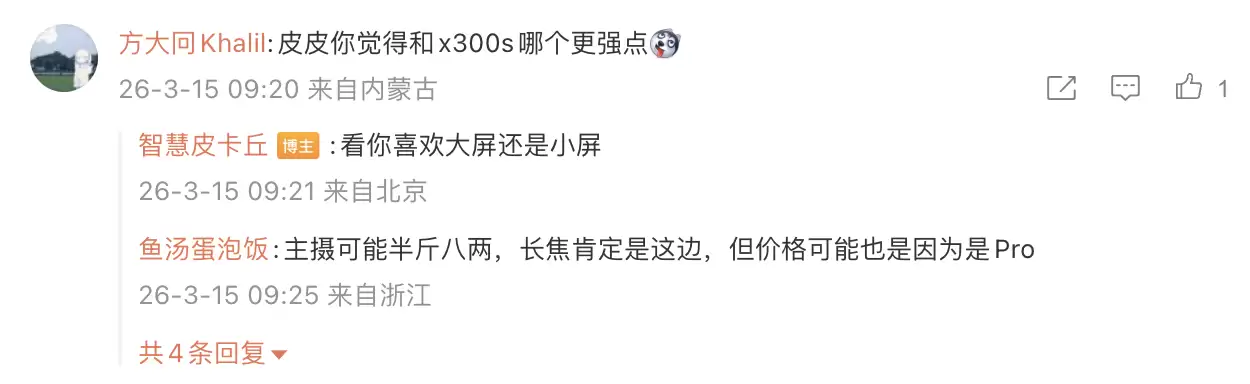 随后有用户在评论区提问:“皮皮,你觉得和X300s相比,哪款更厉害?”博主回复道:“这要看你是更喜欢大屏还是小屏了。”另一位用户则询问道:“扬声器接口用的是那种基础的马达吧 [捂脸]”,博主对此回复了一个“[捂脸]”的表情。