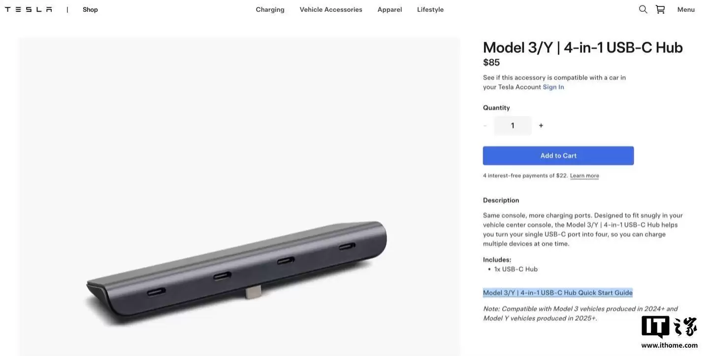 特斯拉海外推出4口USB-C集线器:拓展Model 3/Y接口新方案
