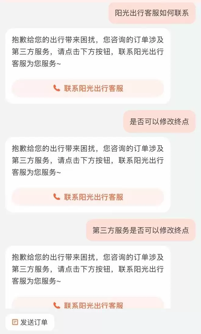 于先生第一时间联系了平台的AI客服,该AI客服告知,由于阳光出行为第三方平台,平台只能协助转接阳光出行客服,与于先生联系。谁知道,转接至阳光出行咨询页面后,上线的又是AI客服,它告知于先生,订单页面可以修改终点,在手机上操作即可。“可是我多次尝试,始终无法修改。”于先生有些哭笑不得。无奈之下,他又拨打了阳光出行的客服热线,可接电话的依然是AI客服,除了重复“手机上可以操作”的提示外,面对于先生“转人工”的诉求,AI客服不断阻拦,坚持要求他“先描述问题,以便更好处理”。就这样,在前后两通共接近20分钟的电话中,他与AI客服陷入了反复的拉扯。