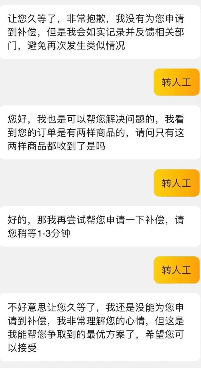 在采访过程中,多位消费者认为,现在的AI客服多数时候被当作“挡箭牌”:一些商家使用AI客服似乎是为了以“秒回”和好态度来搪塞和劝退消费者,而非切实解决问题。