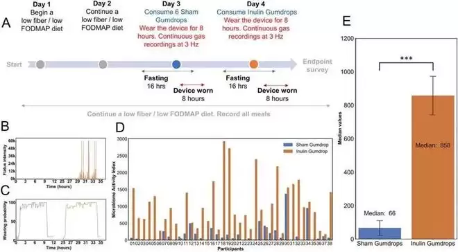 在第二个实验中,38 名志愿者先吃普通软糖,过几天再吃含有 6 克菊粉的纤维软糖。菊粉是一种人体无法消化的膳食纤维,会完整地进入大肠被微生物发酵。智能内裤测试结果显示,94.7%的志愿者在食用纤维软糖之后屁里的氢气明显增加,这个数字说明智能内裤能够灵敏地捕捉到饮食变化引起的肠道菌群的改变。