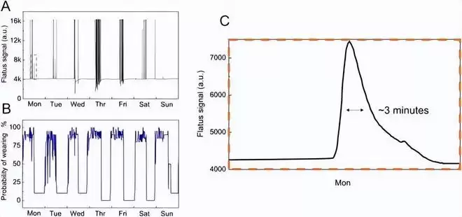 以前医学界普遍认为正常人每天放屁 10 到 20 次,但是智能内裤测出来的平均值是 32 次。最少的一个人每天只放 4 个屁,最多的一个人一天放了 59 个屁。研究团队把这叫做客观测量带来的科学严谨性的提升,说白了以前依靠志愿者自己回忆的测试方法是不靠谱的。