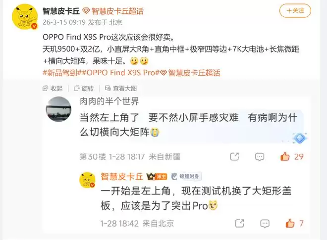 据3月15日PChome的消息,知名博主“智慧皮卡丘”今日发文透露了OPPO Find X9s Pro的核心配置。该机定位为小屏旗舰,搭载了天玑9500+处理器、双2亿像素影像系统以及7000mAh超大容量电池,在轻薄机身内实现了性能、影像与续航的全面升级。