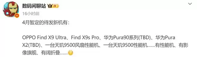 毕竟要到来的机型数量实在是太多了,比如OPPO Find X9 Ultra、Find X9s Pro、华为Pura90系列(TBD)、华为Pura X2(TBD)、一台天玑9500风扇性能机、一台天玑9500性能机等。