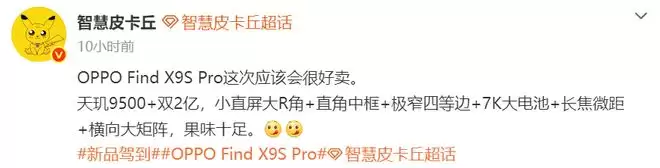 据博主透露,OPPO Find X9s Pro采用小直屏加大R角设计,直角中框加极窄四等边,整体观感果味十足。