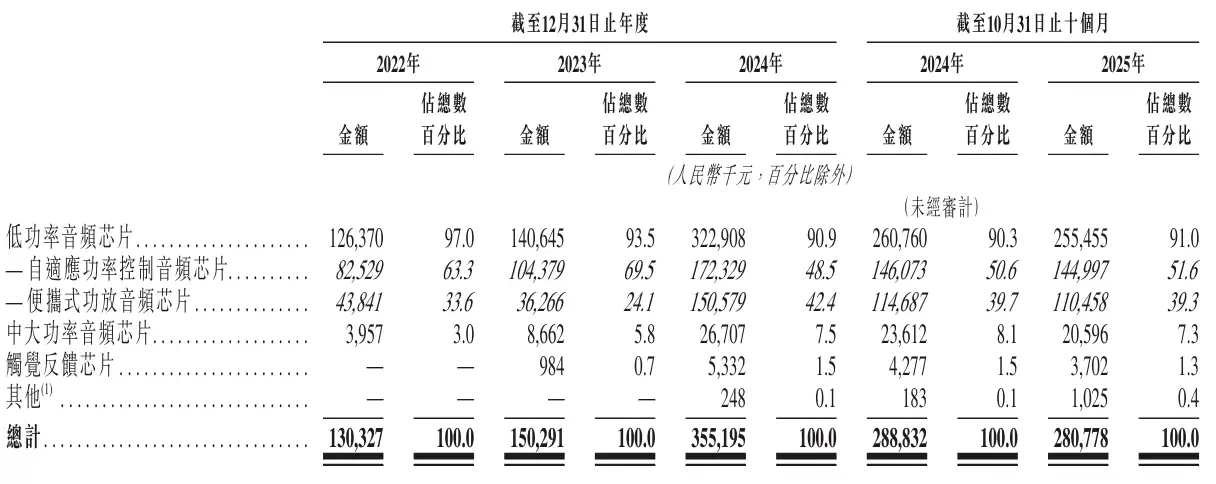 从收入结构来看,在这十个月中,公司主要收入来自两大产品线:自适应功率控制音频芯片贡献了约1.45亿元收入,占总营收的51.6%;便携式功放音频芯片则贡献了约1.1亿元收入,占比达到39.3%。