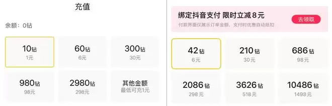 比如刷抖音想直播打赏,安卓的 6 元是 60 钻,iPhone 的 6 元则是 42 钻,少了 30%。