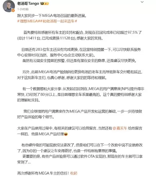 理想MEGA召回进度:超97.5%车辆完成电池更换