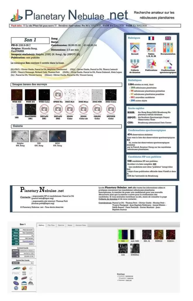 夏教授告诉宋奂达,国际上有一个收录行星状星云的专业 ,需要将数据报上去。其中包含了行星状星云的候选体,经过光谱认证后就可以正式收录。“我就把我发现的原始文件、天体坐标、自己的姓名以及发现过程通过邮件发给了这个 管理员,他也是法国的一个业余天文学家。随后就收到了回信,对方确认这就是一个新的行星状星云,他会帮我收录到数据库,也就是命名。”宋奂达说,按照国际惯例,目前该行星状星云已被hash数据库和行星状星云 的管理员收录为候选体,注册名为son1,并开始为后续的光谱认证做准备。
