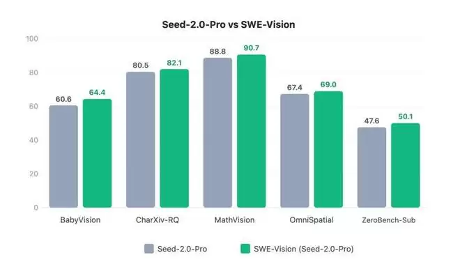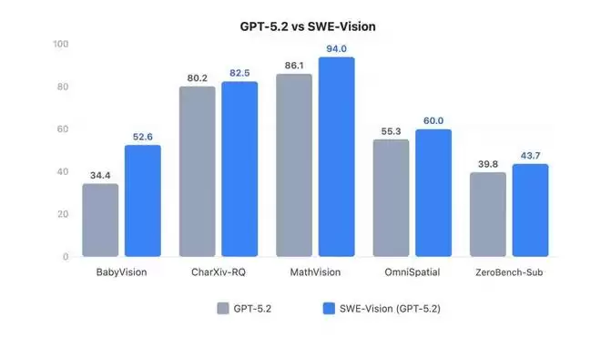 在对比实验中(同一模型 vs SWE-Vision),SWE-Vision 对两个前沿的视觉语言模型(GPT-5.2,Seed-2.0)都带来显著提升: