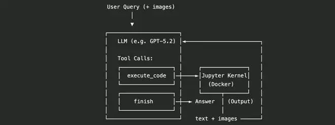 agent.py 里的 VLMToolCallAgent 实现了完整的循环:先把用户问题和图片组织成消息;然后调用支持 tool use 的聊天接口;如果模型发起 execute_code,就把代码送到 notebook 内核执行;再把执行结果作为 tool message 回流给模型;模型据此决定继续调用工具还是 finish。repo 里默认 tool_choice="auto",并支持 reasoning 模式;在开启时会把推理 effort 设为高档,并允许最多 100 轮迭代。