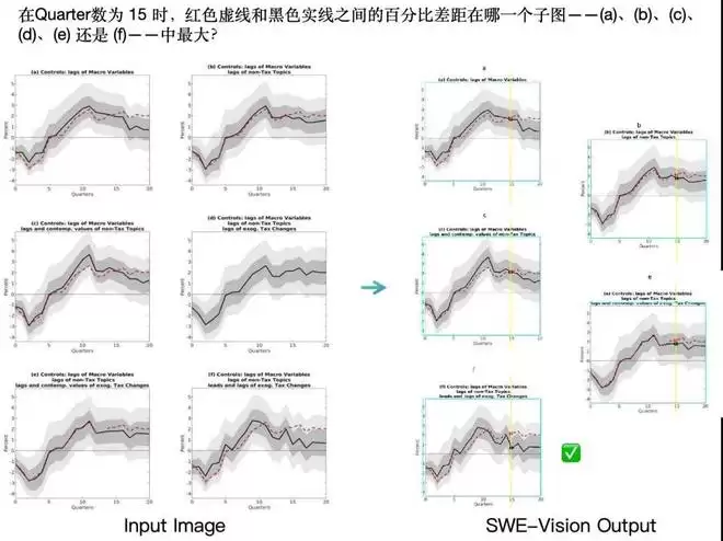 在 SWE-Vision「观察科学图表、总结规律」的案例中,我们看到了一种截然不同的行为模式。如下图所示,这是科研场景中常见的图表分析任务:我们要求模型判断,在 Quarters = 15 时,哪一张子图中红色虚线与黑色实线之间的差距最大。
