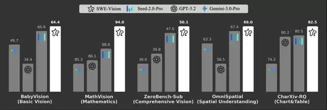 其结果令人瞩目:在五个不同的视觉基准测试中 —— 涵盖基础感知、图表推理、数学问题解决、空间理解和复杂的多步骤视觉挑战 ——SWE-Vision 均提升了前沿 LLM 的表现,如 GPT-5.2-xhigh 和 Seed-2.0-Pro,并取得了最先进的结果:在 BabyVision 上达到 64.4,在 MathVision 上达到 94.0,在 Zero-Bench-Sub 上达到 50.1,在 OmniSpatial 上达到 69.0,在 CharXiv-RQ 上达到 82.5。