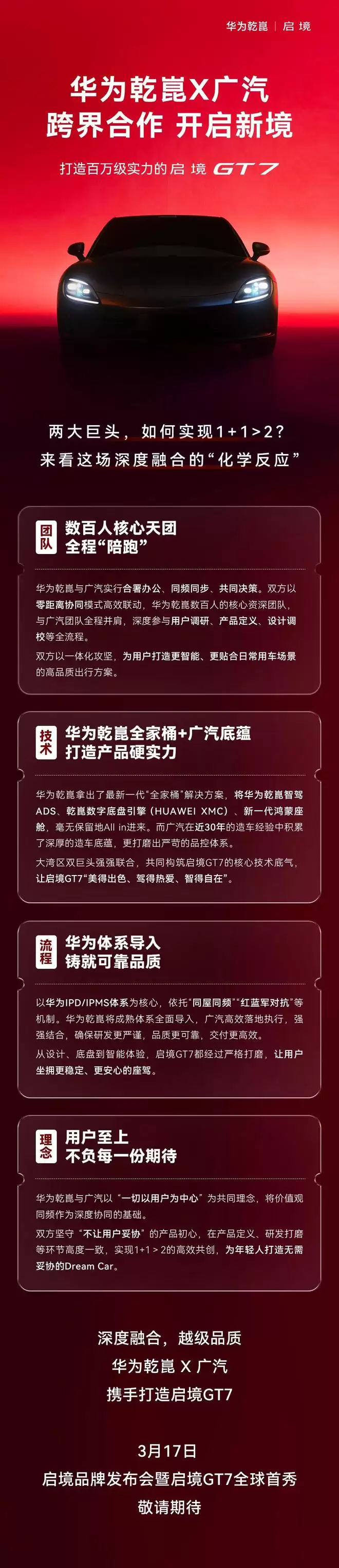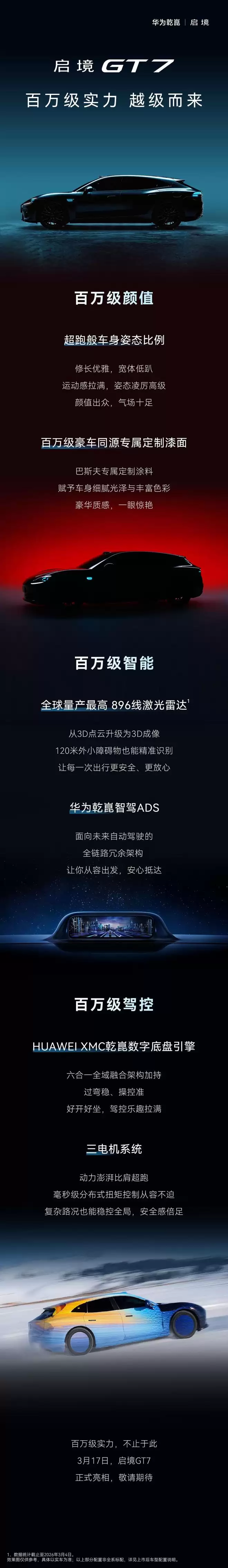 3月16日,IT之家报道称,启境汽车官方微博今天上午发布消息,宣布由华为乾崑与广汽深度融合携手打造的“百万级实力”车型启境GT7将于3月17日全球首发。