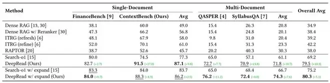 研究人员在四大基准数据集(涵盖单文档/合成多文档数据集)上验证了DeepRead的效果,核心结果参考下表