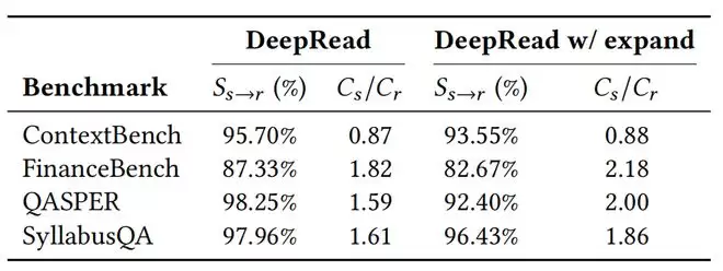 值得注意的是,DeepRead的优势并非来自「更多的检索片段」——即使Search-o1允许检索更多文本块,仍无法弥补结构缺失的差距;而盲目扩展上下文(expand)可能会降低DeepRead在部分任务上的性能,因为结构化阅读已能提供足够连贯的证据,冗余文本只会引入噪声。