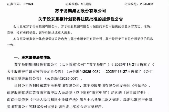 2024年,苏宁易购、鞍山苏宁易购等子公司被债务人申请破产清算;2025年,相关债权人向南京中院申请对苏宁电器集团等公司进行重整;2026年的今天,重整方案落地。