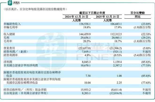 财报显示,2025年,理想汽车实现营收1123.12亿元,同比下降22.3%;净利润为11.39亿元,同比下降85.8%;整体毛利率由2024年的20.5%收窄至18.7%。