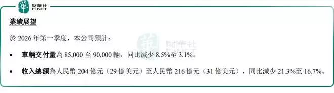 公司预计第一季度车辆交付量将在8.5万辆至9.0万辆之间,同比减少3.1%至8.5%;预计总收入为204亿元至216亿元,同比缩减16.7%至21.3%。