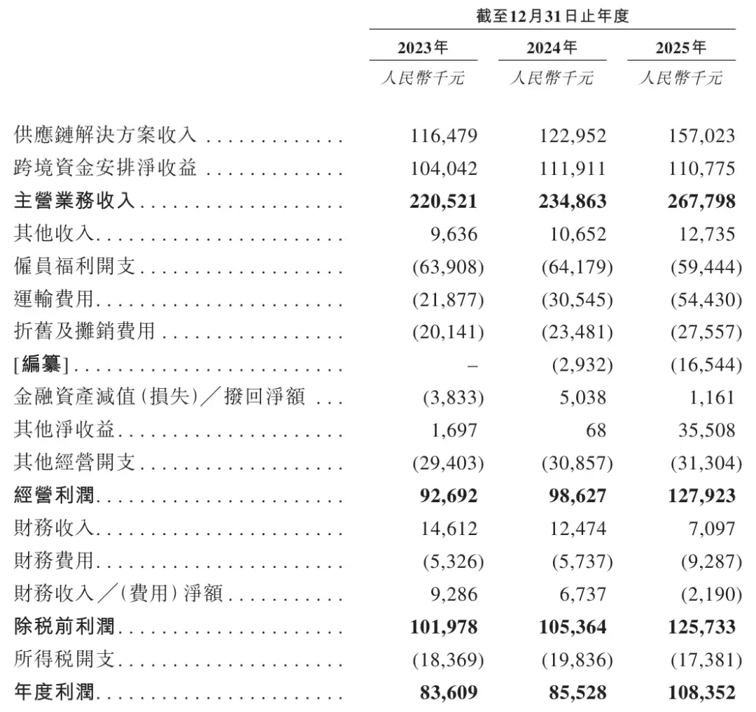 财务数据显示,2024至2025年间,企业营收呈现稳步增长态势,分别录得2.21亿元、2.35亿元及2.68亿元。同期经营利润由9269万元增至1.28亿元,净利润则从8361万元提升至1.08亿元,展现出较强的盈利韧性。值得注意的是,2024年供应链解决方案贡献1.57亿元收入,跨境资金服务则带来1.1亿元净收益,形成双轮驱动的业务结构。