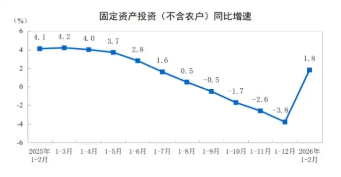 根据国家统计局3月16日发布的数据,2026年1至2月,全国固定资产投资(不含农户)达到52721亿元,同比增长1.8%(此增速低于市场预期的2.1%,也较前值3.8%有所放缓)。其中,民间固定资产投资同比下降2.6%。从环比看,2月份固定资产投资(不含农户)增长了0.39%。