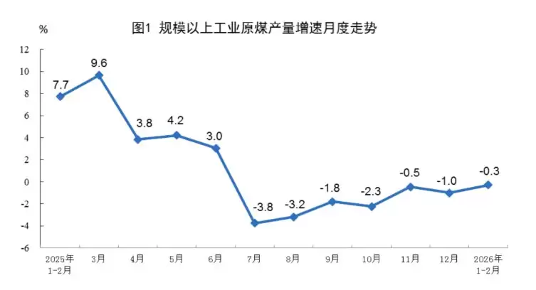 国家统计局3月16日发布的数据显示,今年1至2月,全国规模以上工业原煤产量为7.6亿吨,较去年同期回落0.3%,与去年12月的降幅相比收窄0.7个百分点;日均产量约1293万吨。