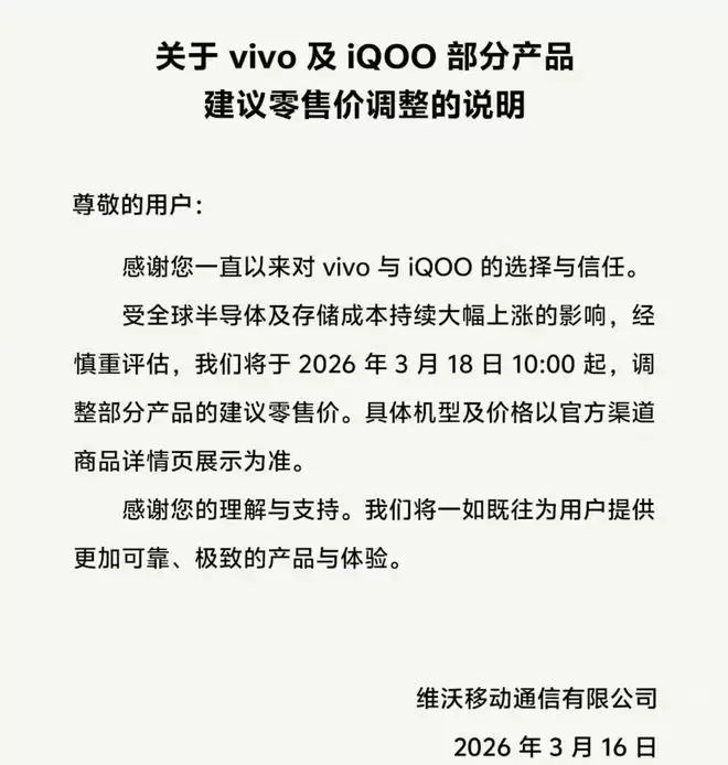 3月16日,vivo发布《关于vivo及iQOO部分产品建议零售价调整的说明》称,受全球半导体及存储成本持续大幅上涨的影响,经慎重评估,vivo将于2026年3月18日10:00起,调整部分产品的建