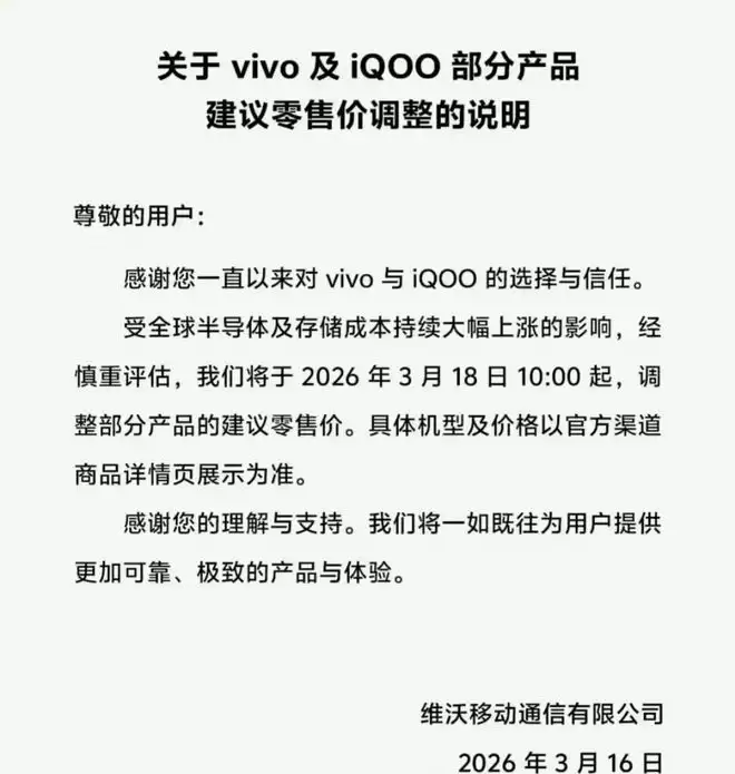 3月16日,vivo发布《关于vivo及iQOO部分产品建议零售价调整的说明》,指出受全球半导体及存储成本持续大幅上涨的影响,经过慎重评估,vivo将于2026年3月18日上午10:00起,调整部分产品的建议零售价,具体机型及价格以最新渠道商品详情页展示为准。