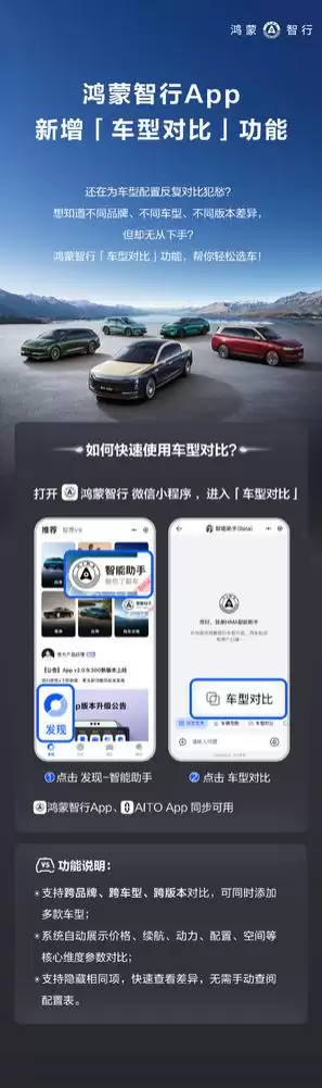 据了解,该功能目前已在鸿蒙智行微信小程序及App端同步上线。用户只需打开微信小程序进入“车型对比”入口,或在App“发现”页点击智能助手,选择“车型对比”即可使用。界面支持同时添加多款车型,对比结果以表格形式清晰呈现,覆盖核心参数,并可一键隐藏相同项,突出差异点。