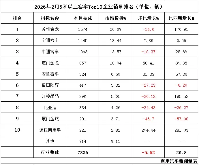 同比增长26.8%!2月6米以上客车市场回暖,远程等4企份额双增