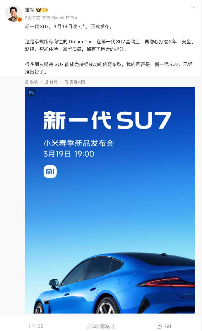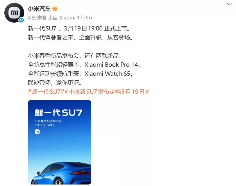 与此同时,小米汽车最新账号也发布消息,确认新一代SU7将于3月19日19:00正式上市。这一消息迅速引发了汽车爱好者和消费者的广泛关注与热烈讨论。