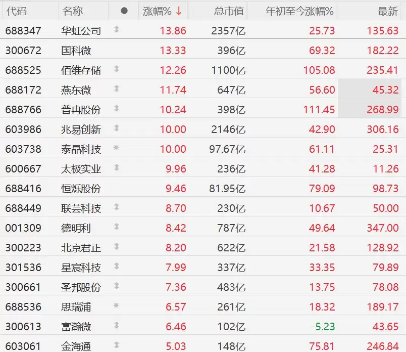 A股半导体板块拉升,华虹、国科微涨超13%