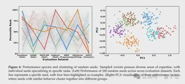 实验显示,没有任何一个随机改动能让模型在所有任务上都实现提升。例如,某一个改动能让模型数学算得更准,但写代码会变菜;另一个改动能让模型化学题做得好,但写故事不行。