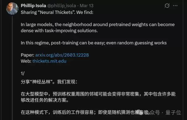 模型权重周围,能提升任务表现的参数扰动变得很密集,所以随机猜测也能找到有效改进方案。