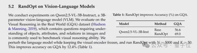 而对视觉-语言模型来说, RandOpt的提升作用则更加明显,准确率直接从56.6%涨到69.0%。